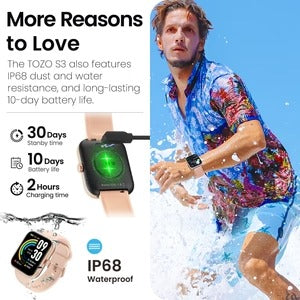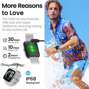 Featuring Bluetooth Calling for seamless communication, a user-friendly 1.83" touch screen, and a comprehensive suite of health monitoring tools, TOZO S3 keeps you connected and in control. With over 100 sports modes, it's your perfect fitness companion. Enjoy up to 10 days of battery life and the resilience of IP68 dust and water resistance, making the TOZO S3 the ultimate fusion of functionality and style on your wrist.